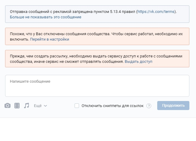 P.S. Если это ваше первое подключение к сервису рассылки, то необходимо выдать доступ к работе с сообщениями или же автосообщение или рассылка не отправится.
