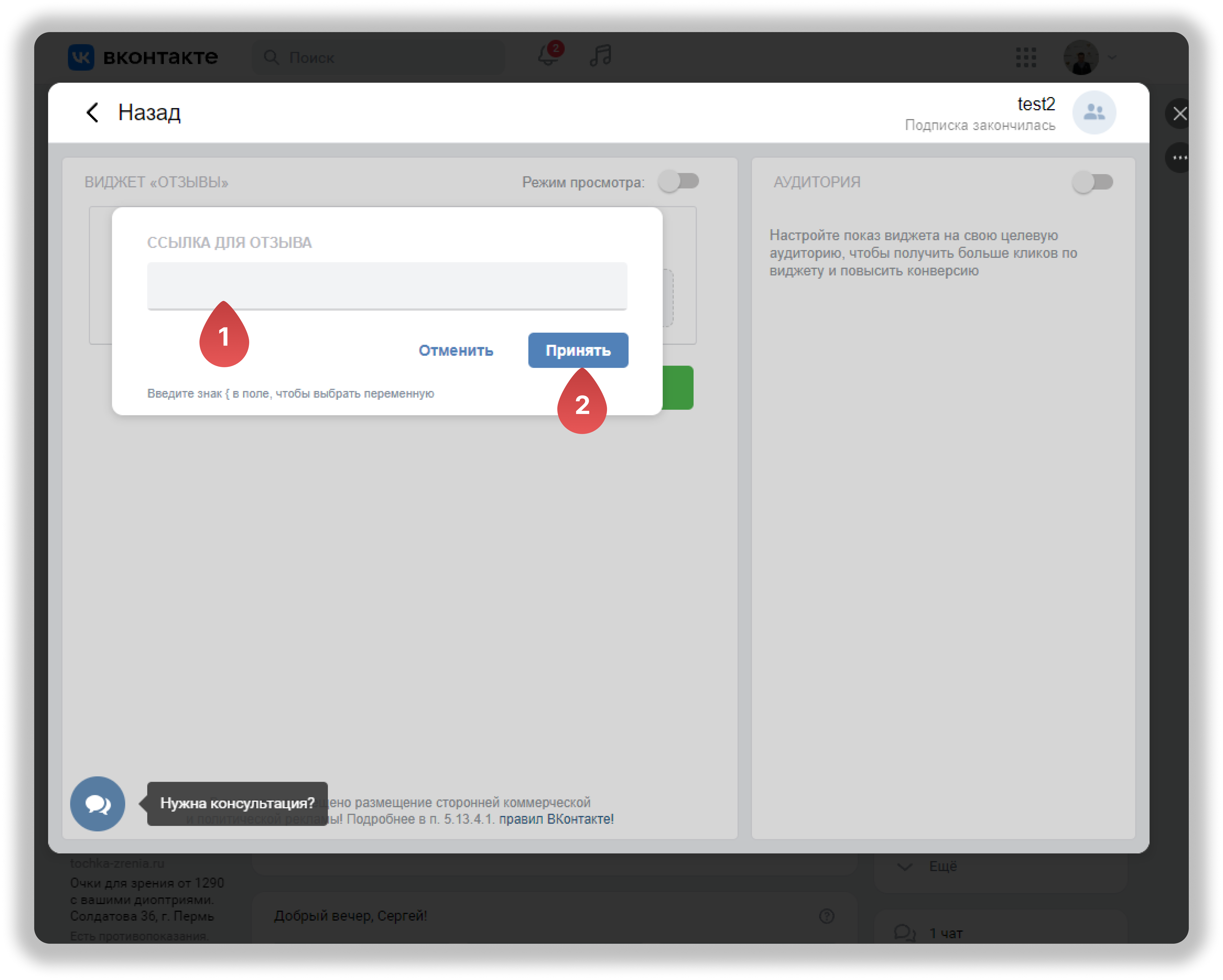 **Шаг 5.** Вставьте подготовленную вами ссылку на отзывы и нажмите "Принять".